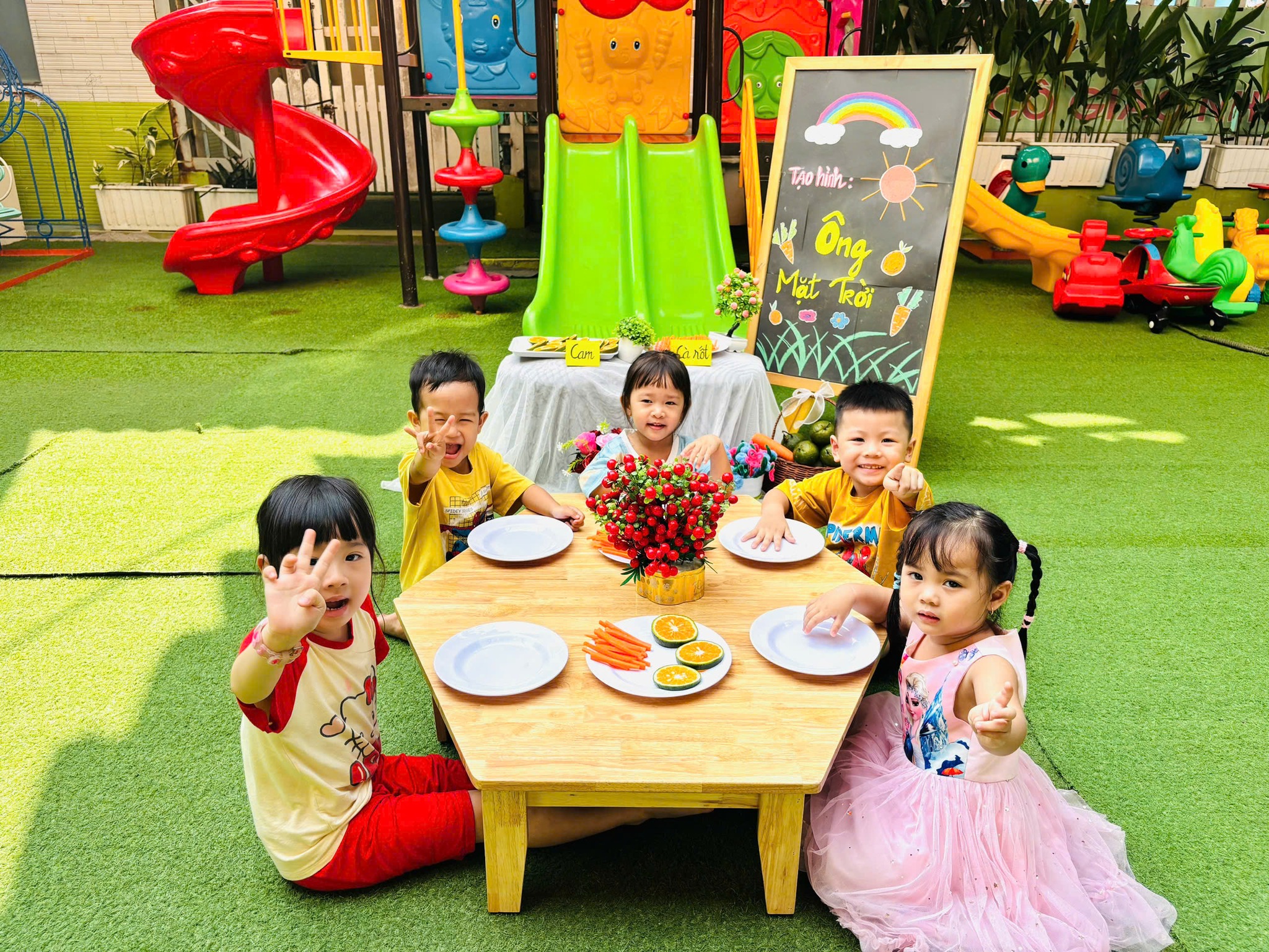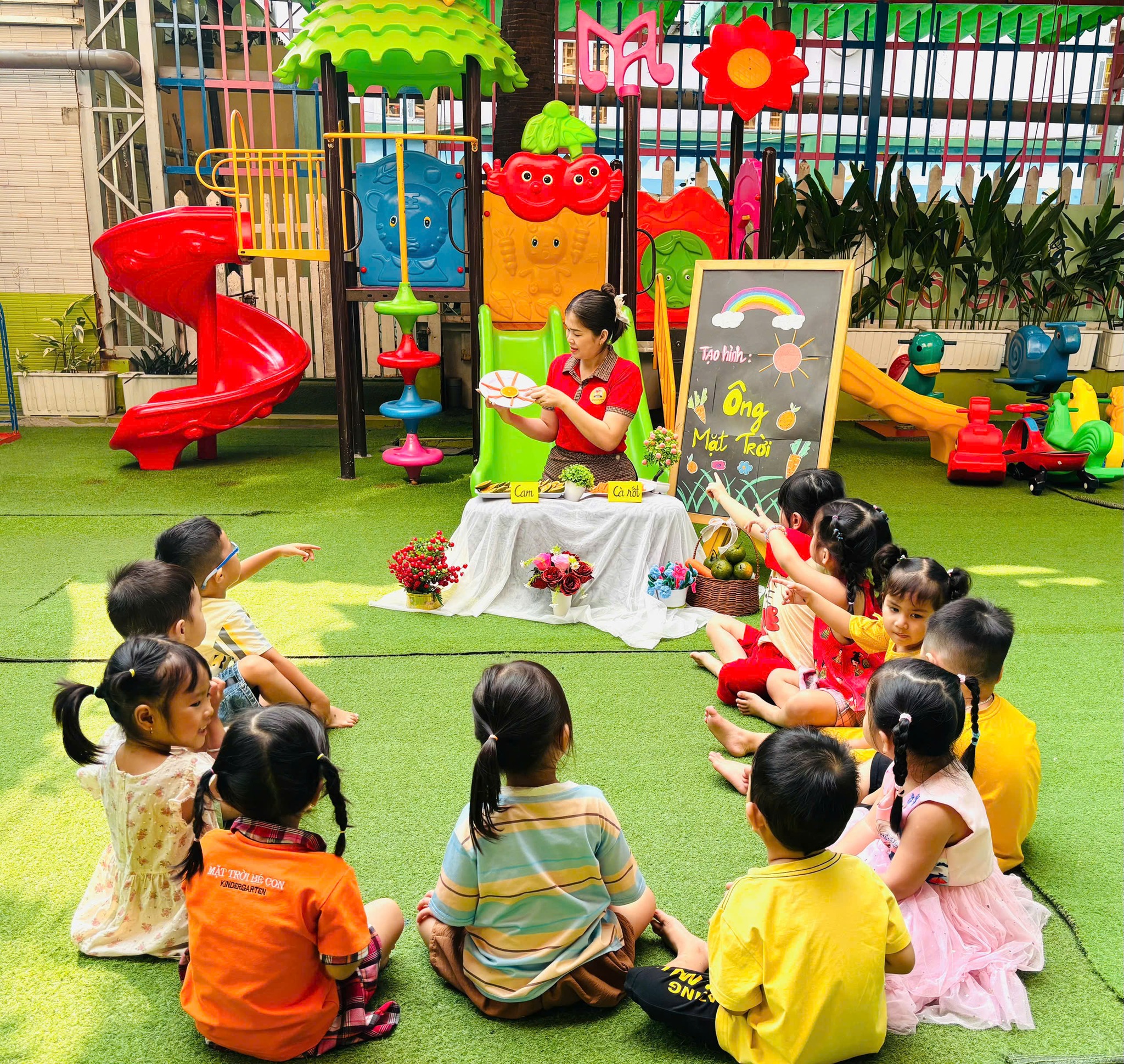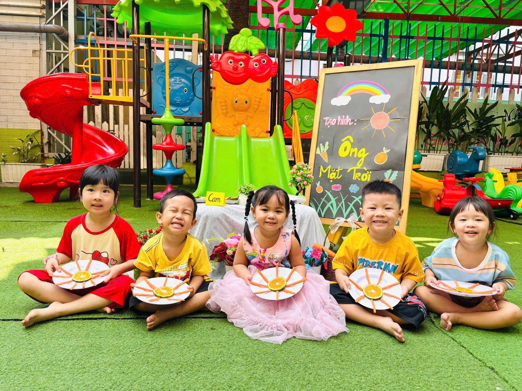 Ông mặt trời óng ánh, tỏa nắng chan hòa khắp nơi hôm nay đã ghé xuống chơi cùng các bạn nhỏ đó ạ!