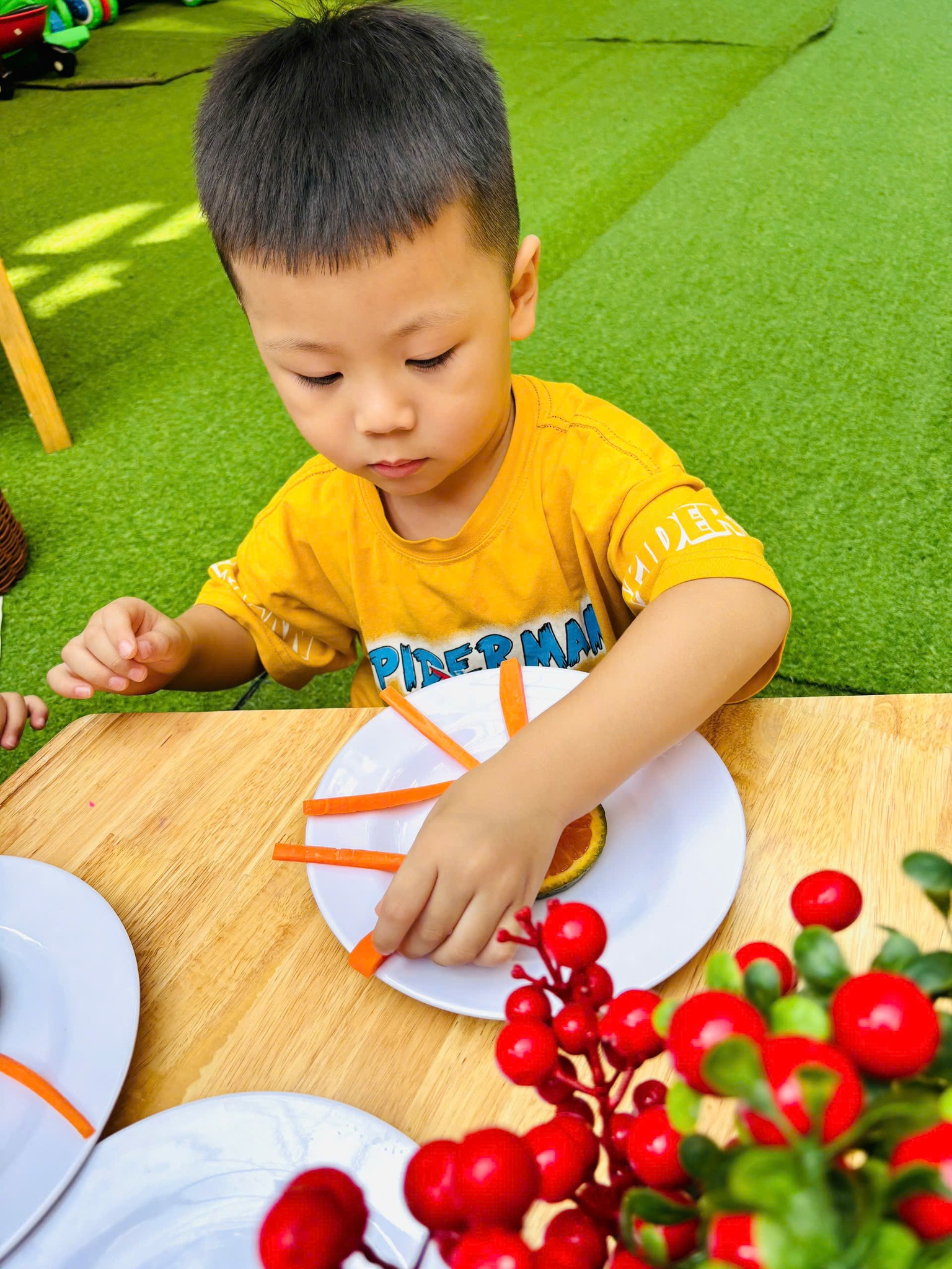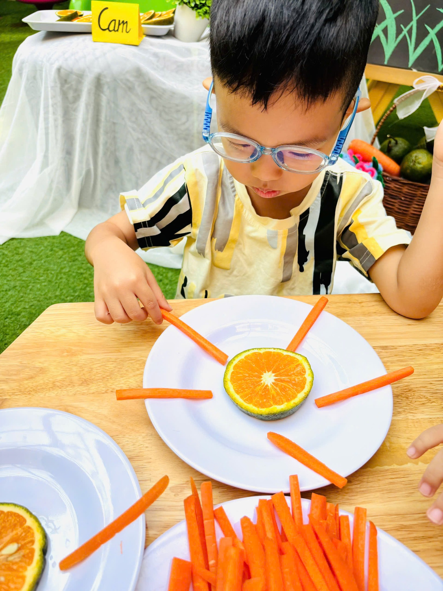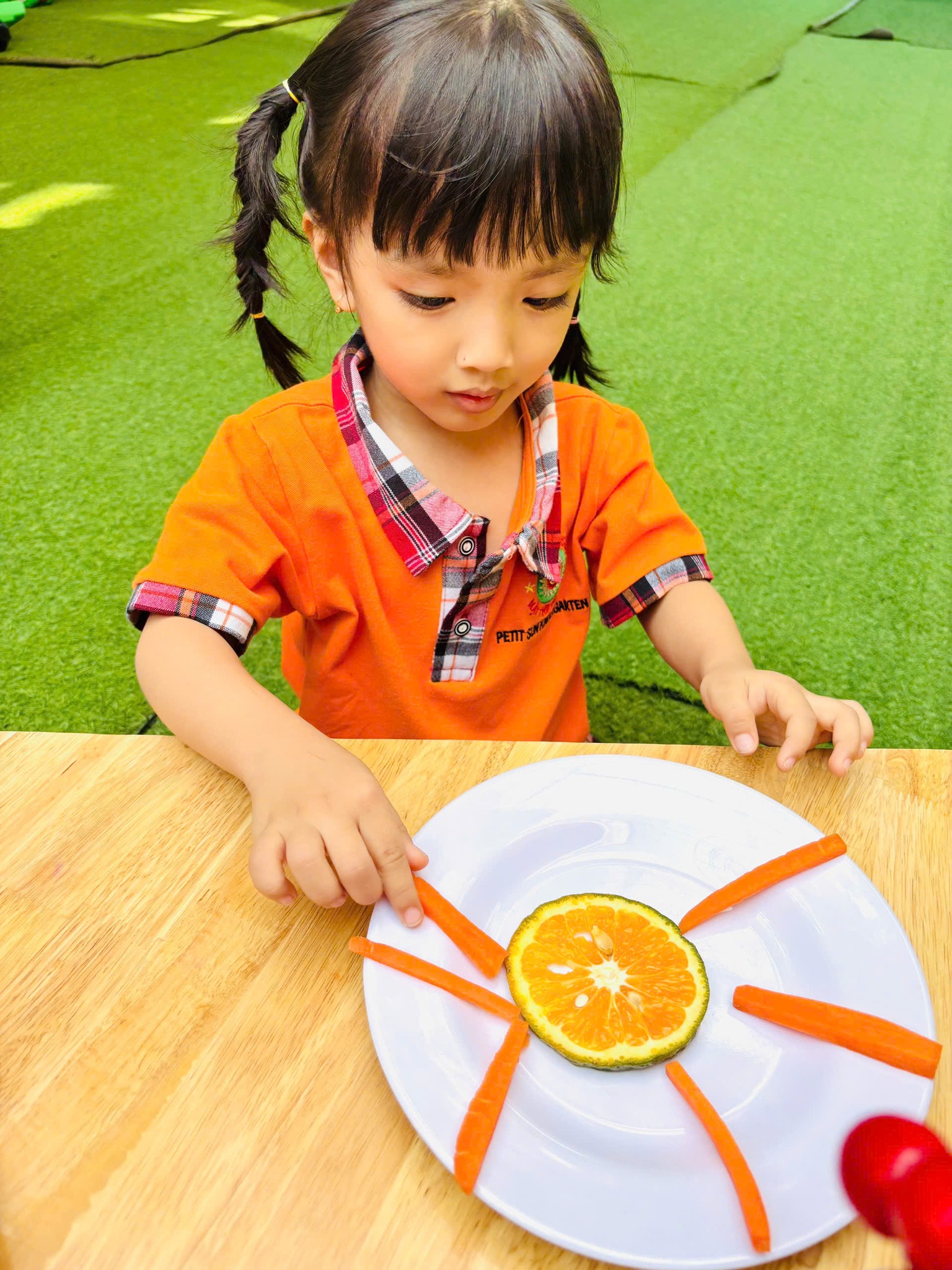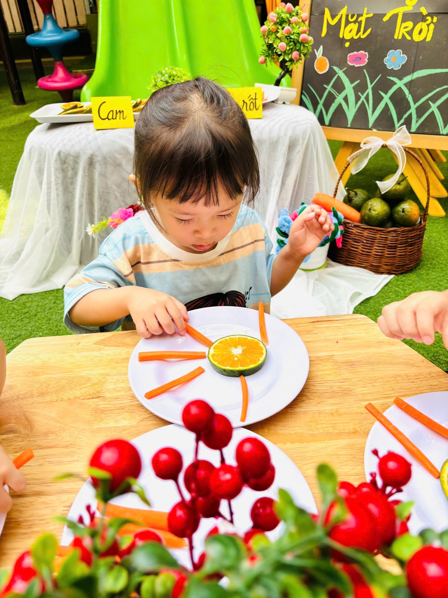 Chỉ bằng những nguyên vật liệu đơn giản từ quả cam và củ cà rốt. Các bạn nhỏ lớp Mầm đã tạo nên "Ông Mặt trời" siêu siêu đáng yêu đấy ba mẹ ạ.